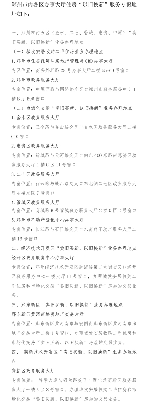 7月16日,記者從鄭州市房管局獲悉,為促進該市房地產(chǎn)市場“賣舊買新、以舊換新”政策進一步落實,鄭州市房管局會同稅務、不動產(chǎn)登記等部門,認真梳理工作流程、全面開設服務專區(qū),全力推進住房“以舊換新”工作。目前,鄭州市內(nèi)8區(qū)10個辦事大廳均開設“以舊換新”服務專窗,辦理相關(guān)業(yè)務可享受“專人專窗”的服務。