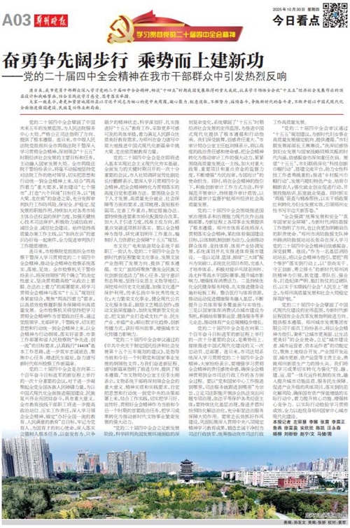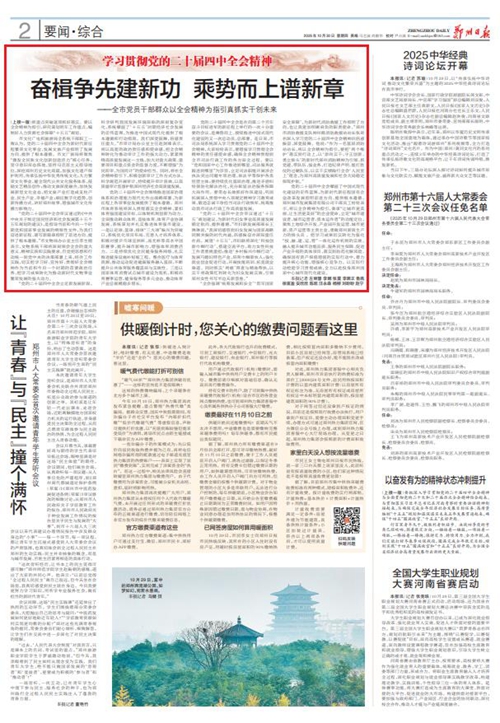 黨的二十屆四中全會擘畫了中國式現(xiàn)代化建設的宏偉藍圖,為新時代新征程國有企業(yè)改革發(fā)展指明前進方向、提供根本遵循,鄭州城發(fā)集團廣大黨員干部群眾深受鼓舞、倍感振奮。近日,《鄭州日報》《鄭州晚報》開設了【學習貫徹黨的二十屆四中全會精神】專欄,2025年10月30日,報道了鄭州城發(fā)集團深入學習貫徹落實黨的二十屆四中全會精神,以全會精神為指引真抓實干創(chuàng)未來。