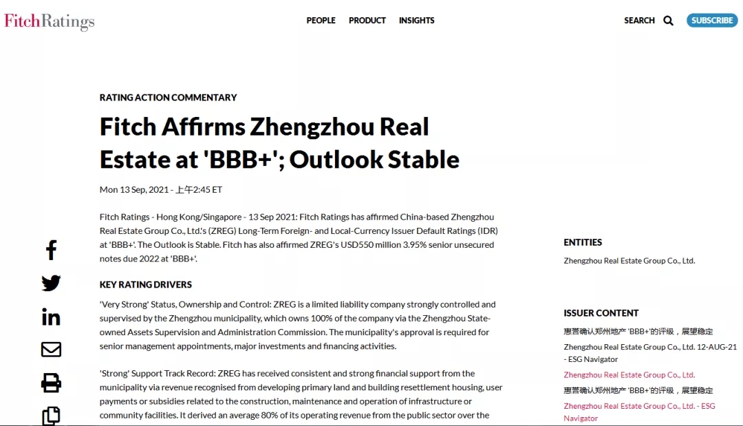 2021年9月13日,惠譽(yù)國(guó)際評(píng)級(jí)確認(rèn)鄭州地產(chǎn)集團(tuán)有限公司(簡(jiǎn)稱:鄭州地產(chǎn))發(fā)行人評(píng)級(jí)為“BBB+”,展望穩(wěn)定。
