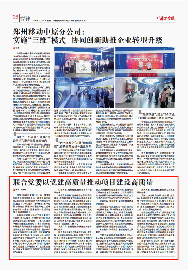 西流湖公司始終堅持“抓好黨建就是最大的政績”,創(chuàng)新“黨建進(jìn)總包合同”合作模式,貫徹落實(shí)“支部建在項(xiàng)目上,黨旗飄在工地上”的工作思路,以中原新區(qū)中部片區(qū)土地一級開發(fā)聯(lián)合黨委和項(xiàng)目黨支部建設(shè)為抓手,以“12343”黨建工作體系為指引,讓黨的主張、黨的作風(fēng)、黨組織的力量在項(xiàng)目建設(shè)中處處彰顯,充分激發(fā)黨員的先鋒模范作用和黨組織的堅強(qiáng)堡壘作用,將黨建轉(zhuǎn)化為生產(chǎn)力,真正實(shí)現(xiàn)黨建促發(fā)展的“紅色引擎”作用。公司黨建工作先進(jìn)經(jīng)驗(yàn)榮登《中國企業(yè)報》,意味著公司黨建工作先進(jìn)經(jīng)驗(yàn)對于全國企業(yè)黨建具有良好的借鑒意義,標(biāo)志著公司黨建工作及宣傳水平再上新臺階。